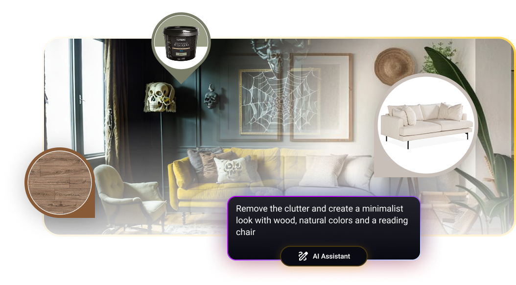 Our AI Assistant is here to make your dream space a reality - no matter how bold or unique your ideas are. Want to add a cozy reading nook? Change the color scheme? Mix modern with vintage? Just tell our AI what you want and it will seamlessly integrate your small, big or even wildest ideas into your design. Whether you have a clear vision or need a little inspiration, our assistant adapts to your needs and helps your create a home that truly reflects your style.